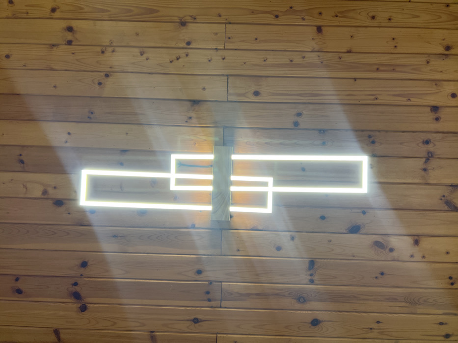 A vertical wooden plank wall, composed of light-toned, knotty wood, serves as the background. Centrally mounted on this wall is an illuminated light fixture, designed as a stylized cross. The fixture features a central horizontal wooden block, from which multiple glowing rectangular light tubes extend. Specifically, two vertical tubes extend upwards, two vertical tubes extend downwards, and two shorter horizontal tubes extend laterally from the central wooden block, creating a segmented cross pattern. Beams of visible light are observed traversing the upper left quadrant of the image, interacting with the illuminated fixture. This scene is located in Poibrene, Bulgaria.