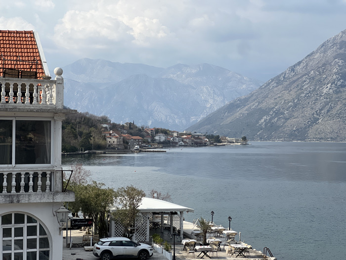This image depicts an exterior scene in the city of Bogdašići, Montenegro, showcasing a bay and surrounding mountains under an overcast sky