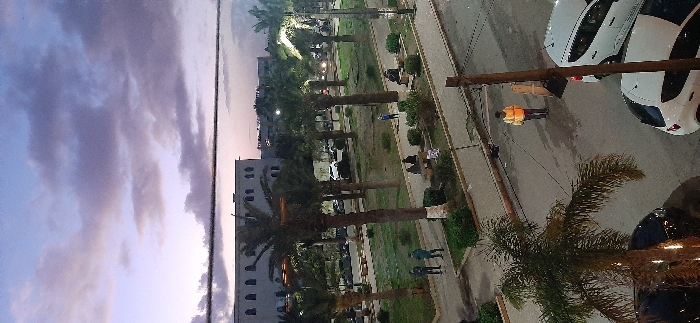 A tall building stands next to palm trees and a park with people sitting on benches. Cars are parked along the street. A man in an orange vest stands near the street, beside a utility pole. The sky is a mix of blues and purples.