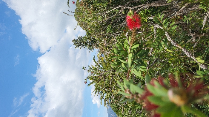 The image depicts an outdoor natural environment in Calvià, Spain, under a bright blue sky partially covered by scattered white cumulus clouds. The foreground and mid-ground are dominated by dense green foliage, primarily shrubs and trees. Specifically, a red *Callistemon* (bottlebrush) flower is clearly visible towards the mid-right of the frame, with another blurred red bottlebrush flower partially present in the extreme lower-left foreground. Numerous branches with small green leaves and distinctive clusters of greyish-white seed pods or immature flower spikes are distributed throughout the vegetation layers. The background consists of further dense green trees and shrubs, extending upwards from the lower frame. A faint, distant landscape, appearing as hills or a distant urban area, is visible on the far-left horizon, suggesting an elevated viewpoint. No individuals, specific man-made objects, or discernible actions are present within the scene.