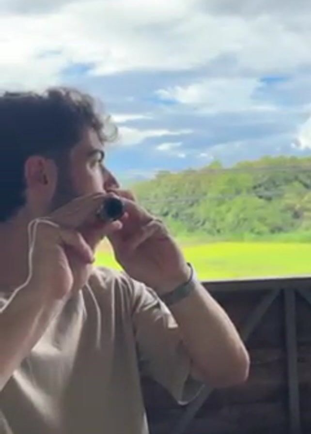 A man is seen playing a small, dark-colored flute or wind instrument. He stands on what appears to be a wooden porch or balcony with a view of a green landscape under a cloudy sky. The man has dark curly hair and a beard. He is wearing a light tan-colored t-shirt and a watch on his left wrist. He holds the flute up to his lips and fingers and seems focused on playing the instrument.