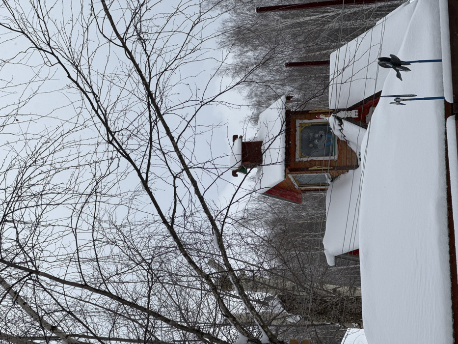 The image depicts a winter scene in Chaikovsky, Russia, characterized by heavy snow cover and bare deciduous trees under an overcast sky. The central subject is a small, ornate wooden structure, possibly a decorative playhouse or a miniature building, situated atop a larger, uniformly snow-covered roof. This smaller structure features a reddish gabled roof, completely blanketed in snow, and a brown wooden facade with intricate trim. A snow-covered, brick-red chimney with green accents rises from its roof. Two visible windows on the structure show a cartoon-like blue wolf character depicted inside one. The main roof it rests upon is deep with snow, obscuring its underlying features, and several thin wires or cables run across its surface. In the lower right foreground, two dark, bird-shaped wind spinners are mounted on blue poles, protruding from the snow. The immediate background is dominated by a dense stand of bare birch trees, their white trunks contrasting with their dark, leafless branches. Further back, a line of more distant, bare trees forms a hazy horizon against the light gray sky. A tall, thin, light-colored structure, possibly a chimney, is partially visible through the trees on the left side of the frame. Two reddish poles are visible on the far right. No individuals are present in the scene.