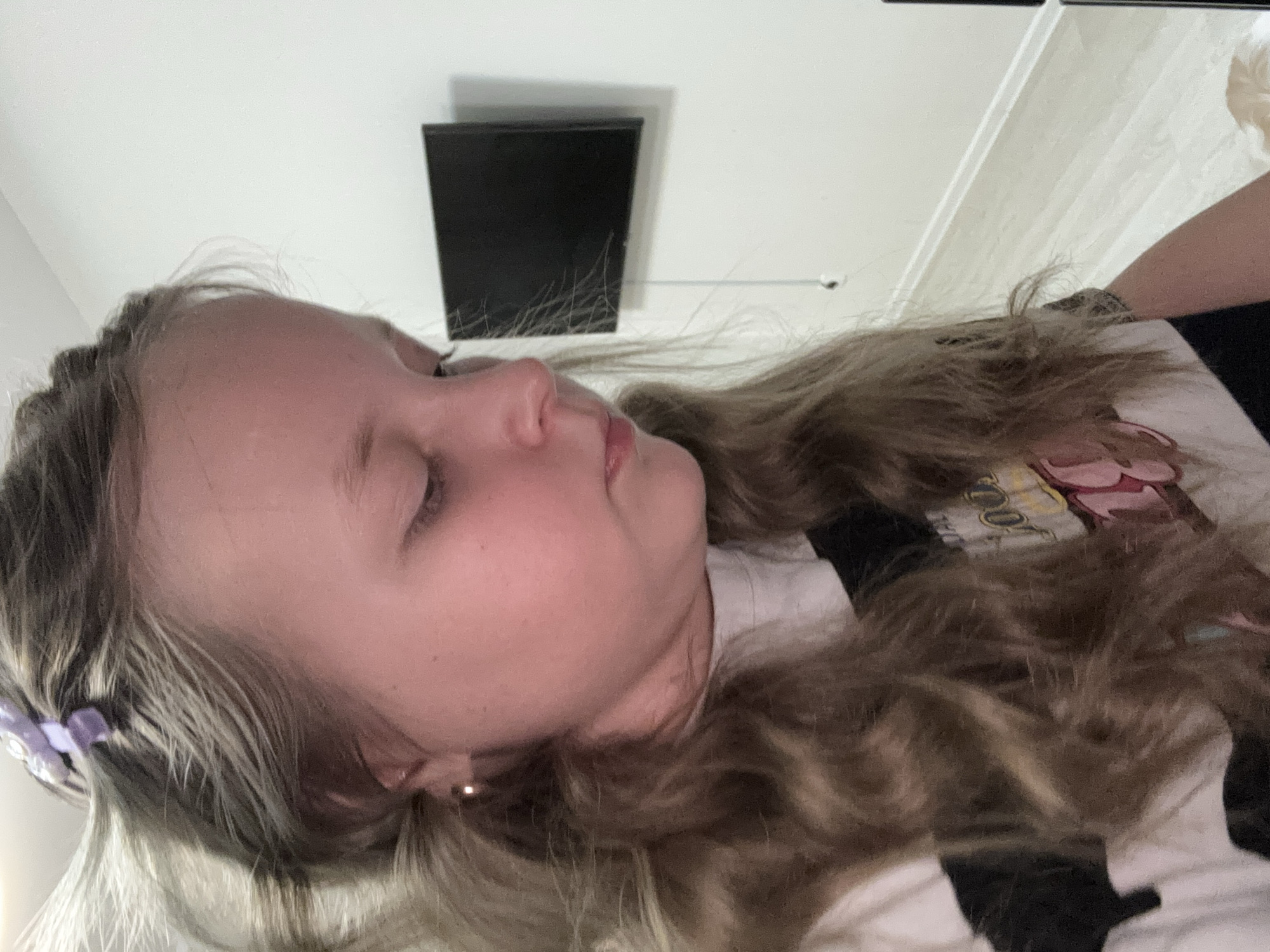 A girl is lying down indoors. She has long blonde hair and is wearing a hair accessory. She is wearing an earring. There is a black rectangular object mounted on the wall. The setting appears to be a room with white walls. The location is unknown and cannot be determined from the image.