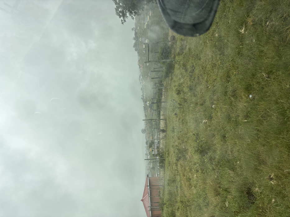 This image depicts a residential landscape in Cuba B, South Africa, under overcast and misty conditions. The foreground consists of an unkempt grassy field with green and brown patches, containing scattered litter including plastic debris. In the bottom right corner, a portion of a dark grey cap or hat brim is visible. A low, light-colored wire mesh fence with wooden posts runs horizontally across the midground, separating the field from the developed area. To the left of the fence, a circular building with red-orange roof tiles and light-colored walls stands. To the right, utility poles are sparsely distributed. The background features a densely settled hillside with numerous small residential structures, characterized by various roof colors, obscured by a pervasive mist or fog. The sky is uniformly light grey-green, indicating heavy cloud cover and diffused light, significantly reducing visibility of distant features. No individuals are discernible, and no direct actions or interactions are captured.