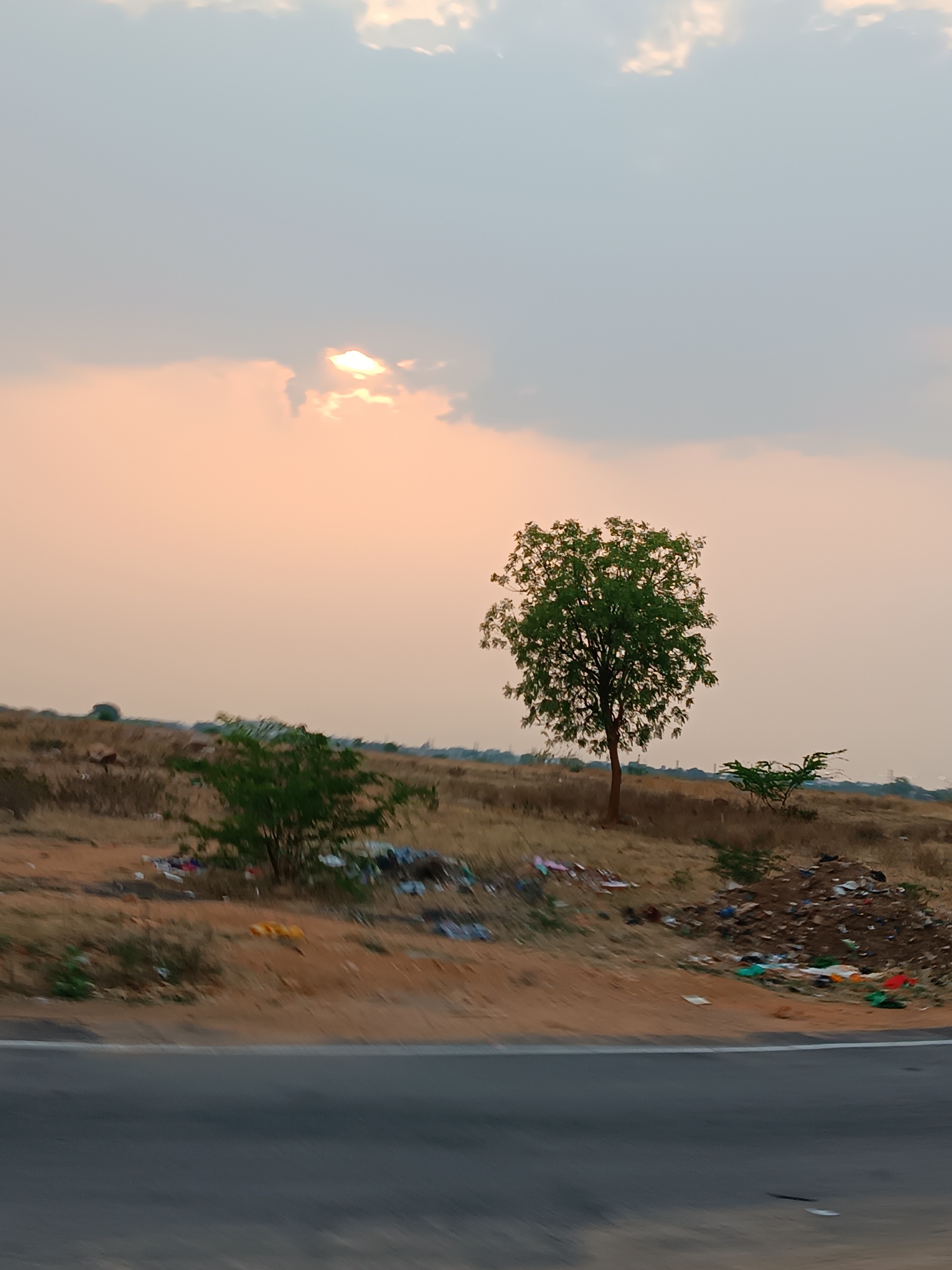 The image depicts a scene in Potlamarri, India. A road occupies the lower portion of the frame. Beyond the road, there is a barren, scrubby landscape with visible litter and garbage scattered across the ground. Two trees, one larger and one smaller, stand prominently in the center of the image. The sky is overcast with clouds and a slight orange hue near the horizon, suggesting either sunrise or sunset. There are no visible people or actions taking place.