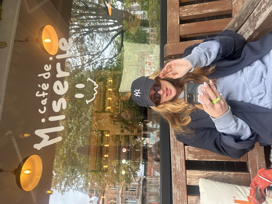 A woman is depicted seated on a slatted wooden bench outside "Café de Miserie" at Kloosterstraat 14, Antwerp, Belgium. She has long wavy blonde hair and wears a black New York Yankees baseball cap, dark oval sunglasses, a light gray hooded sweatshirt, and a dark navy blue blazer. The woman holds a dark-colored smartphone, equipped with a heart-shaped pop socket, in her left hand, which displays multiple rings and light-colored nails with dark polka dots. Her right hand is raised to touch the rim of her sunglasses. To her left on the bench, a light-colored cushion and a partially visible orange object are present. The large window of the café behind her features the white text "Café de Miserie" and a stylized smiling face. The window reflects elements from both the café's interior, including warm-toned pendant lights and a faint reflection of a person, and the exterior, showing green-foliaged trees and a multi-story brick building with distinct architectural features, consistent with an urban street environment.