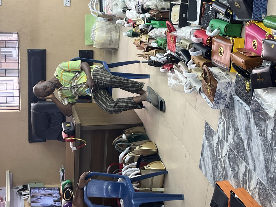 The image depicts an indoor scene in Satellite Town, Nigeria, resembling an office or storage area. The environment features light beige/tan walls and a tiled floor composed of plain light-colored sections and grey-and-white marbled sections. A barred window is visible in the upper background, and a monitor displaying multiple camera feeds is mounted on the left wall above a power outlet strip. In the foreground and midground, a significant quantity of new merchandise, primarily luxury handbags, wallets, and some shoes, is spread across the floor and stored under a wooden desk. These items vary in color, including green, red, black, gold, brown, pink, and white, with many still in plastic packaging or open retail boxes. Branding such as "MONALOY" on a large shopping bag and a "Dior" pattern on a shoe box is discernible. Several handbags are arranged under the desk to the left, and a red-and-black handbag with a gold chain strap rests on the desk surface. An adult male, bald and appearing to be of African descent, is seated on a blue plastic stool to the right of the desk. He wears a short-sleeved, collared plaid shirt (green, white, and brown tones) and dark plaid trousers. He holds a light blue smartphone in his left hand, with his right elbow propped on his right thigh and his head resting in his right hand, eyes closed, suggesting he is resting or asleep. His feet are bare, and a pair of grey slides are on the floor beneath his left foot. To the far left, a dark-skinned arm and part of a torso are visible, indicating another individual is seated on a blue plastic chair, facing away from the camera. Behind the desk, a black executive office chair is present.