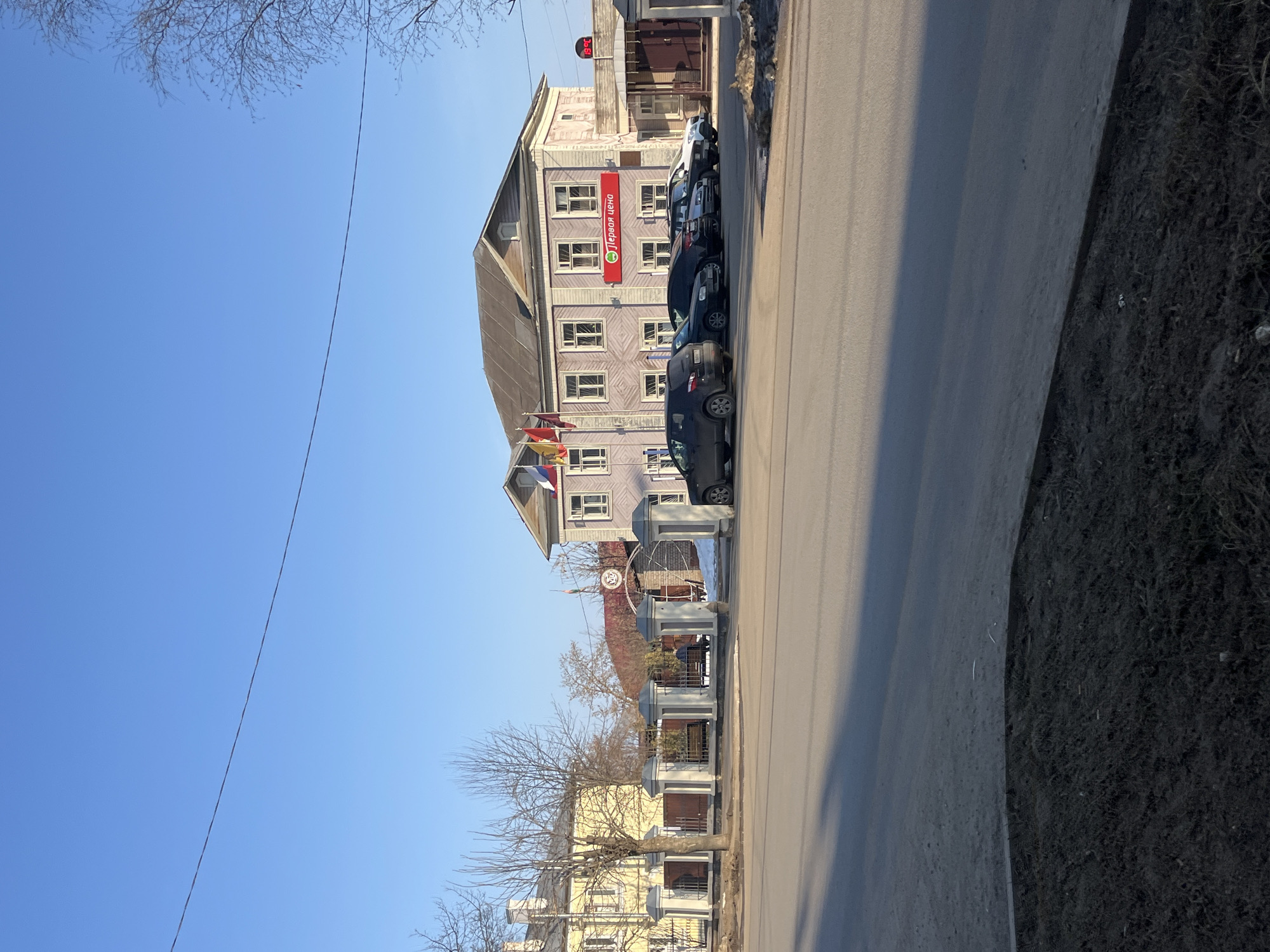 This image depicts a street scene in Kladovitsy, Russia, under a clear, bright blue sky. In the center-right, a two-story light purple/grey building with a brown roof features a prominent red sign displaying "Первая цена" (Pervaya Tsena / First Price) in white lettering. To the left of the sign, multiple flags, including a Russian national flag, are mounted on poles. A digital display on the building's right side shows "13°C". Several vehicles, including black, dark grey, and white cars, are parked diagonally in front of this building, facing the street. To the left of the main building, a decorative fence with white concrete pillars and dark metal railings encloses a property. Behind this fence, a person is seated on a bench near an ornate archway. Further left and behind the fence, a two-story yellow building with white architectural details is visible. The foreground consists of an asphalt road with a dark, dry dirt and sparse vegetation verge on the immediate bottom. Long shadows are cast across the road from unseen structures to the left, indicating the sun's position. Numerous bare deciduous trees are present throughout the scene, notably on the left and right edges of the frame, suggesting a late winter or early spring setting. A single overhead wire traverses the upper portion of the sky. Patches of dirty snow or melted slush are visible near the fence on the right. No other individuals or significant actions are observable.
