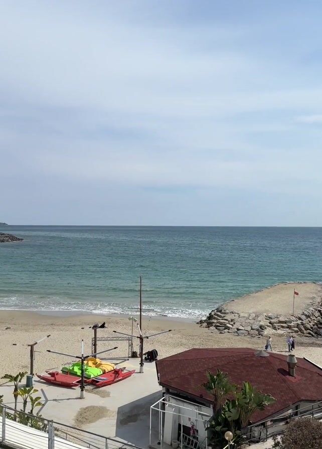 The video captures a panoramic view of a beach town, transitioning from a close-up of a building with a red roof to a wider shot revealing a sandy beach and a turquoise sea. The building is accompanied by palm trees and parked bicycles nearby. A pier made of rocks extends into the water. The beach is dotted with various objects including paddle boats. People are seen walking along a paved road parallel to the beach, where more bicycles are parked. In the distance, the town's buildings and hills form a backdrop against a sky partially covered with clouds. The scene appears to be taken from an elevated position, providing a comprehensive view of the coastal landscape.