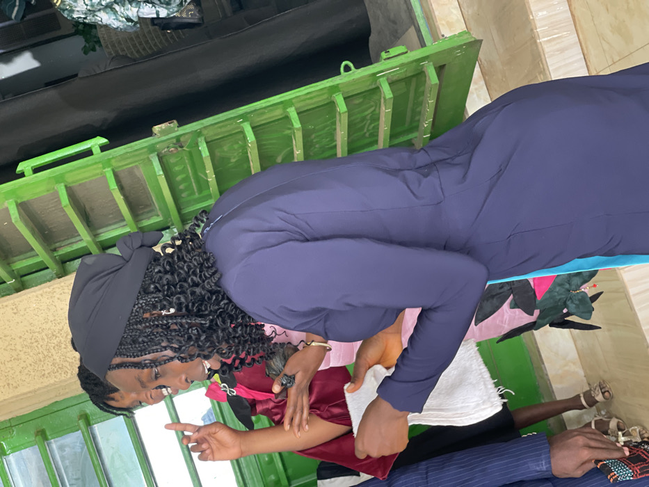 The image captures an indoor setting in Kufena, Nigeria. In the foreground, a woman is positioned with her back partially to the viewer, wearing a dark blue, long-sleeved dress and a black headwrap over her dark, curly braided hair. She holds a piece of white, textured fabric in both hands. To her left, a second woman is visible in profile, wearing a maroon garment. She gestures with her right index finger extended upward and holds a small, dark, irregularly shaped object in her left hand. Her facial expression suggests she is speaking or laughing. On the far left, a portion of a person's arm wearing a pinstriped suit sleeve is visible, holding a patterned clutch. A pair of light-colored sandals is visible on the floor near the bottom left. The background is dominated by a vibrant green, multi-slatted wooden structure, likely a door or shutter, displaying some wear with lighter marks. A light-colored wall is present on the upper left, and the floor appears to be light-toned.
