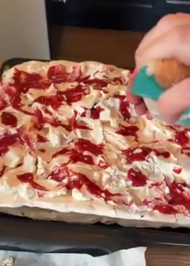 A woman is preparing a dessert, possibly a sheet meringue. The dessert base, baked on a black baking sheet lined with parchment paper, is topped with dollops of white cream and a red sauce, likely a fruit coulis. The woman's hands, adorned with a ring and red nail polish, sprinkle sliced almonds from a turquoise bag onto the dessert. The background includes a wooden table and a dark cabinet. The environment suggests a domestic kitchen setting.