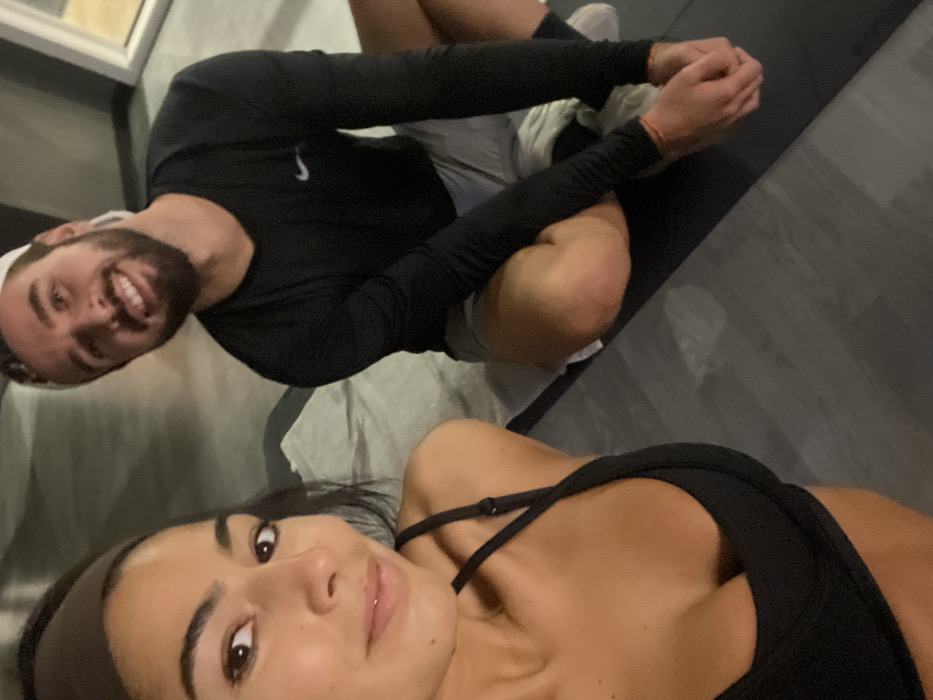 A forensic examination of the image reveals two individuals, one female and one male, captured in a selfie-style photograph. The scene is located in Wattrelos, France. The female is positioned in the foreground, her face and upper torso visible. She has dark hair, partially pulled back by a dark headband. She wears a black sports bra. Her eyes are open, directed towards the camera, and her lips form a slight smile. The male is seated behind and to the right of the female, in a cross-legged position on a dark mat. He wears a black long-sleeved athletic shirt with a white Nike swoosh logo on the left chest, light-colored shorts, and a white baseball cap worn backward. He has a beard and is smiling broadly, with his hands clasped in front of him. An orange wristband is visible on his right wrist. Both individuals are situated on individual dark-colored exercise mats. The floor beneath the mats is a dark, possibly grey or black, smooth surface. In the upper right background, a window or reflective panel is visible. The overall lighting suggests an indoor environment. No specific activity beyond posing for the photograph is directly evident, though their attire and mats suggest an exercise or wellness setting.