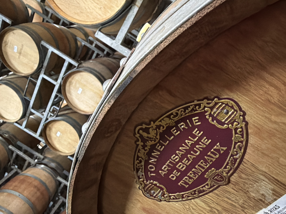 The image depicts an indoor scene within a wine storage facility in Drakenstein Nu, South Africa. The foreground features the curved, light-brown wooden surface of a wine barrel, viewed from a slightly elevated angle. A prominent, ornate dark-red and gold label is affixed to this barrel, bearing the text "TONNELLERIE ARTISANALE DE BEAUNE TREMEAUX," accompanied by a rooster emblem and a stylized 'T' in a shield. A smaller, partially visible white label below it shows "ch 2025." In the background, numerous identical light-brown wooden wine barrels are systematically stacked on grey metal racks, forming multiple tiers and rows. Each barrel is secured with metal bands, and several display small white identification tags on their ends. No people are visible. The environment appears to be a well-organized wine cellar dedicated to barrel aging.