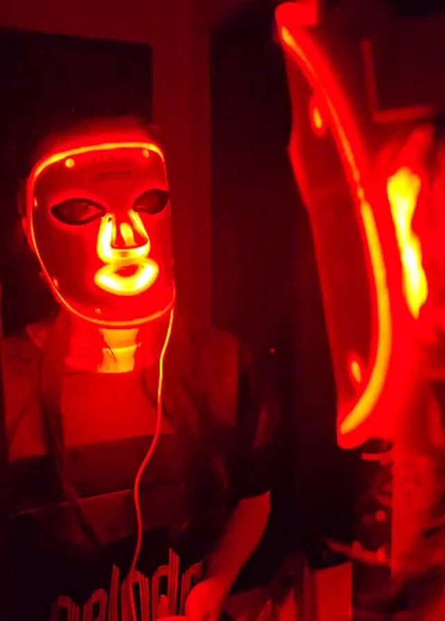 A person wearing a black shirt and a white LED face mask is holding a small, white electronic device