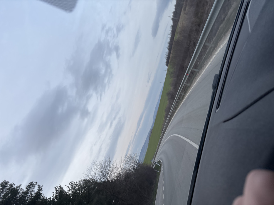 The image displays an exterior scene captured from within a vehicle, looking forward through the windshield, on a curving road near Mindia, Bulgaria. The vehicle's dark-colored dashboard occupies the bottom quarter of the frame, with a partial view of a hand on the extreme lower left. A windshield wiper mechanism is visible at the base of the windshield. The main subject is a two-lane asphalt road that curves prominently to the left, receding into the distance. The road features a solid white center line and a dashed white line marking the right shoulder. On the immediate left side of the road, a dense natural barrier of trees is present, composed of mature evergreen trees at the upper edge and bare deciduous trees closer to the road. A white road sign with a red border is partially visible on the inner side of the curve. To the right of the road, a metallic guardrail runs parallel to the asphalt, equipped with red reflectors on its posts. Beyond the guardrail, the terrain slopes gently upward, revealing a wide field of vivid green vegetation, indicative of grassland or agricultural crops. Further back on the right, sparsely vegetated ground with bare shrubs and smaller trees is visible. The background consists of distant rolling hills under an expansive overcast sky. The sky is dominated by various shades of grey clouds, suggesting a cloudy day with diffused lighting. No individuals or direct interactions are visible. The scene portrays a rural or semi-rural landscape.