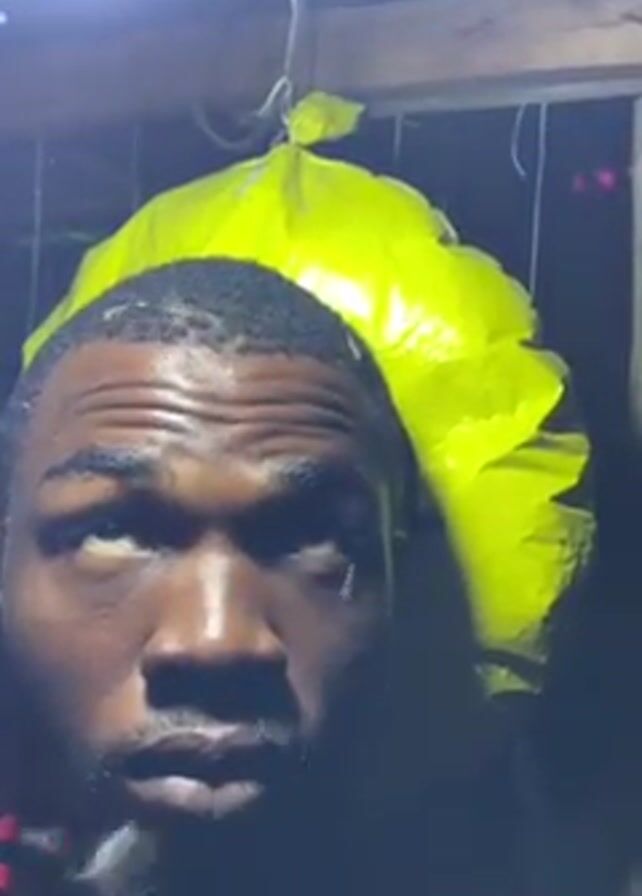 A dark-skinned man with a beard is looking up at a bright light in a low-lit area