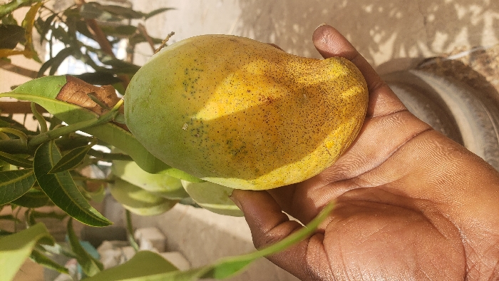 This image depicts a close-up outdoor scene in Sabon Tasha, Nigeria. The primary subject is a dark-skinned human hand gently supporting a single, partially ripened mango still attached to its branch. The mango exhibits a distinct transition from green at its top to a mottled yellow-green and solid yellow coloration towards its base, with numerous small, dark speckles visible across its surface. In the immediate background, several other green, unripe mangoes are visible, hanging from branches laden with green leaves. One leaf displays a prominent brown, desiccated patch. The background includes a light-colored, possibly sandy or concrete, ground surface, and a segment of a dark, circular object, consistent with a tire, is visible in the lower right. The scene is brightly illuminated by natural sunlight, casting discernible shadows.