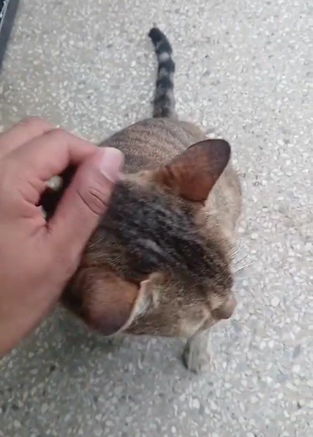 A brown tabby cat stands on a speckled, stone floor. A hand pets the cat's head. The cat's tail is upright with a black tip. A black gate is visible in the upper left corner of the frame.