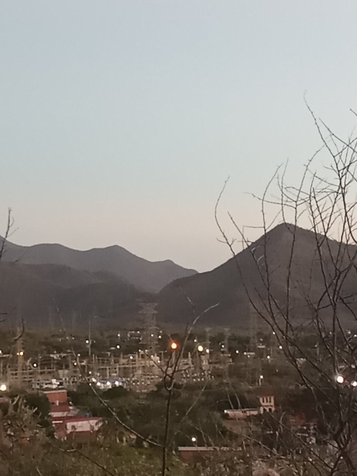 An elevated, panoramic view of a landscape in La Tagua, Venezuela, captured during twilight. The foreground is partially obscured by dark, out-of-focus, leafless tree branches extending from the bottom and right edges of the frame. The midground reveals an expansive electrical substation or industrial complex, characterized by numerous interconnected structures, poles, and multiple glowing artificial lights. Below and surrounding this complex, several buildings with visible roofs, including red-tiled structures, are discernible. A prominent lattice-style electricity transmission tower stands in the center-left midground. The background features successive ridges of dark, undulating mountains stretching across the horizon, appearing hazy. The sky above is a clear, pale grey-blue, transitioning to a lighter tone towards the horizon. No people or active interactions are visible.