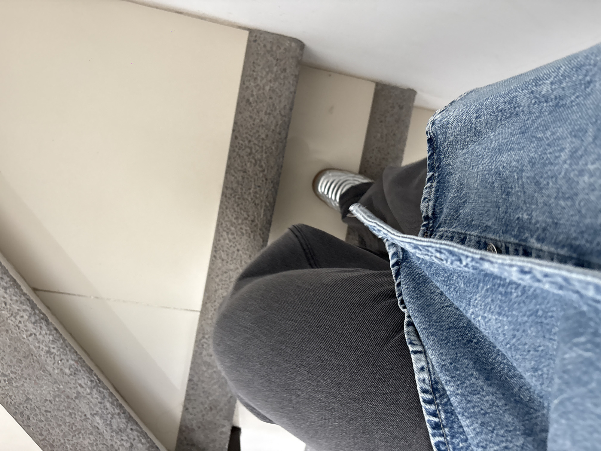 The image displays a first-person, downward view of an individual seated on a staircase in San Juan Cuautlancingo, Mexico. The subject wears dark grey pants, with a light blue denim garment draped over their lap. The visible right foot is adorned with a metallic silver shoe featuring a horizontally ridged design and a visible brown sole. The staircase consists of light-colored, likely off-white, tiled treads bordered by a darker grey, granular material on the edges and risers. A clean, plain white wall is visible on the right side of the frame.
