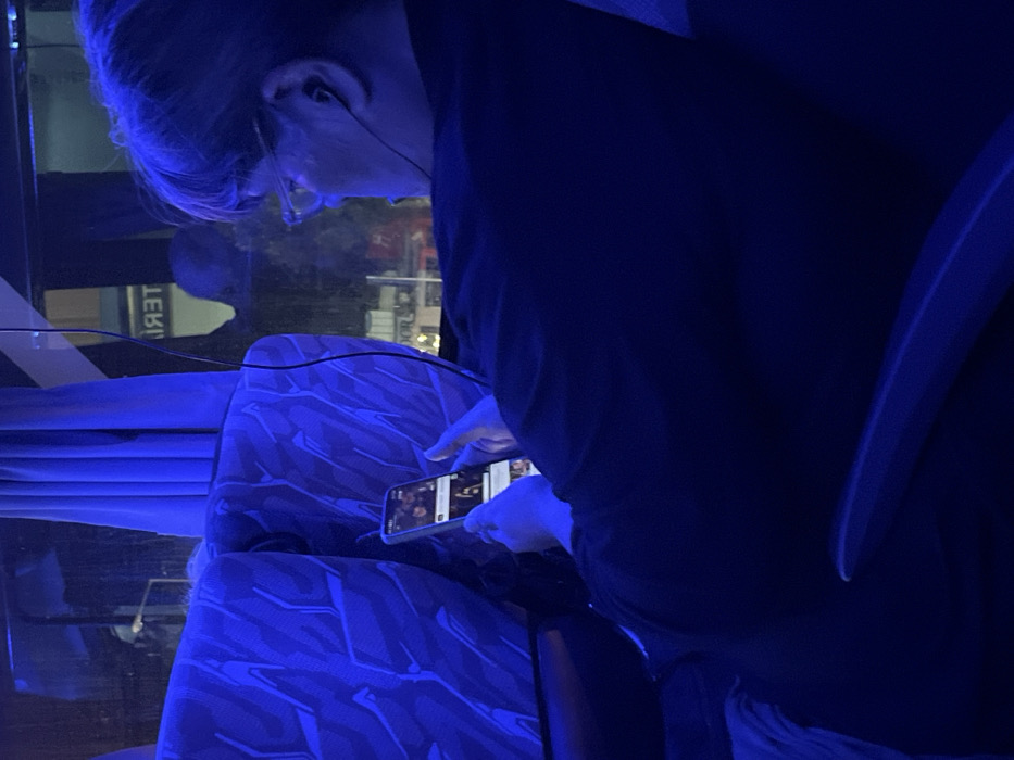 A person sits in a vehicle, possibly a bus, illuminated by blue light