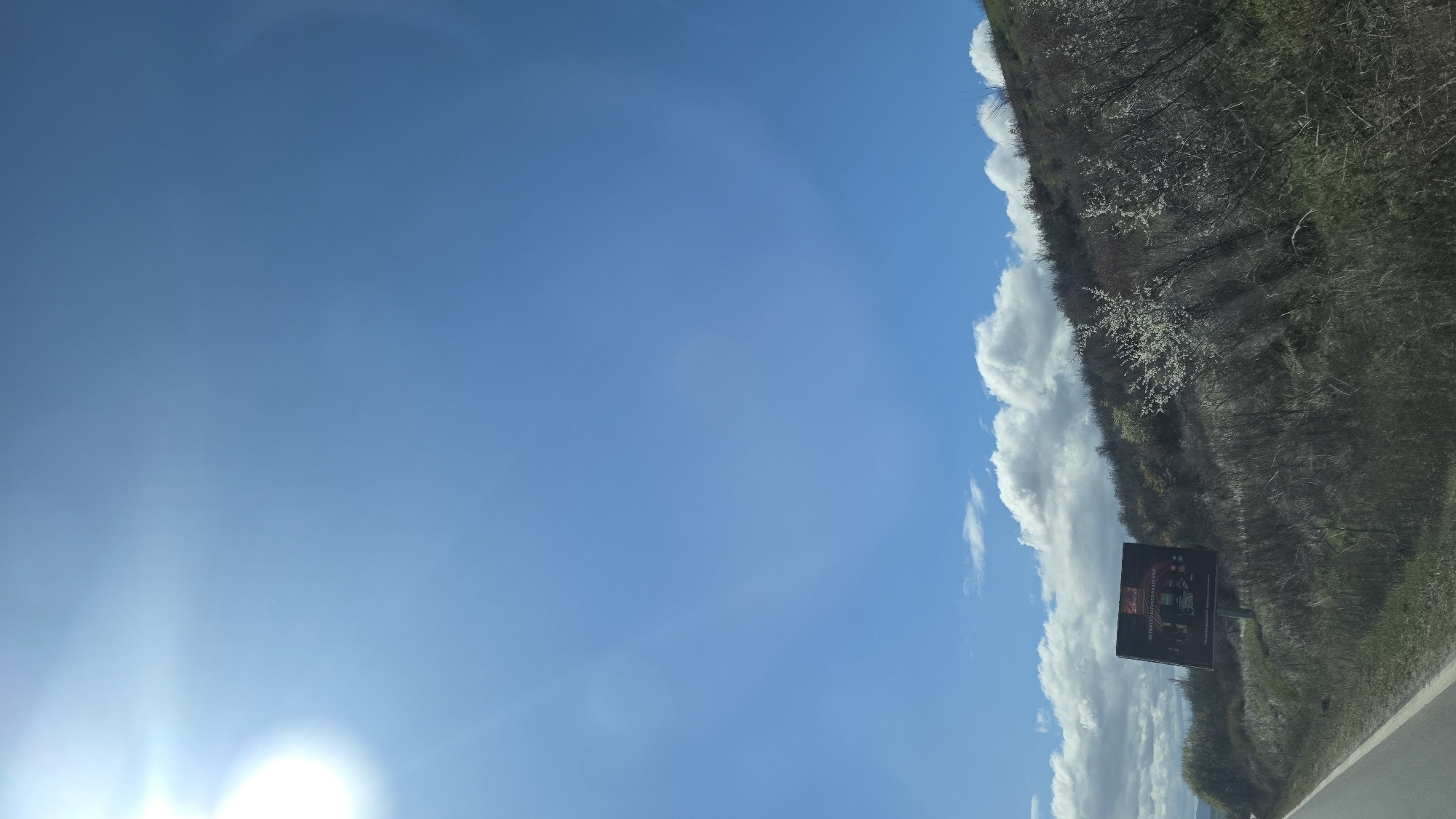clear blue sky with some scattered clouds on the upper right side, near a forested area. At the edge of the forest, there is a large advertising billboard. The image appears to have been taken from a vehicle traveling on a road. Based on the presence of the billboard and the landscape, the location is in the city of Kocherinovo, Bulgaria.