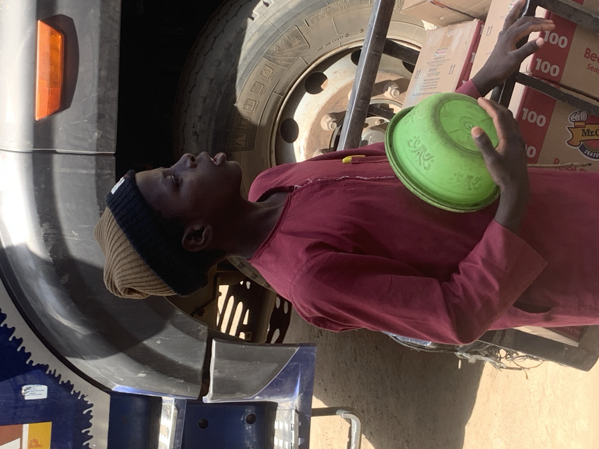 In Fagge C, Nigeria, a young individual, possibly a pre-adolescent or early adolescent male, stands outdoors in bright sunlight. The person is depicted in profile, facing right, with a slightly open mouth. They wear a two-tone knit beanie (brown top, black bottom) with a white label, and a long-sleeved, collared maroon garment that features a yellow object, possibly a pen, in a left chest pocket. The individual's right hand supports a green plastic bowl adorned with embossed patterns. Their left hand rests on a dark metal frame, which is part of an unseen cart or trolley. Stacked cardboard boxes, some marked "100" and bearing a partial "Mr. C" brand logo, are visible behind the individual, resting on this structure. In the background, a large, dark blue truck is partially visible, showing a portion of its cab with a white serrated graphic, a grey fender, an amber side marker light, and a large, dirty tire on a dark rim with exposed lug nuts. The ground beneath is unpaved, light brown, and dusty.
