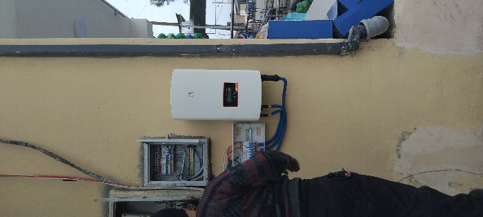An outdoor wall installation in Aktash, Uzbekistan, is depicted forensically. The light beige wall, showing minor cracking and discoloration at its base, features mounted electrical equipment. A person, viewed from behind and positioned on the left, wears a dark plaid long-sleeved shirt and dark trousers, with their hands near the electrical components. An open metal electrical box containing multiple circuit breakers and wiring is affixed to the wall above a smaller, open electrical panel also housing circuit breakers. To the right of these panels, a white rectangular power inverter is mounted, displaying "kW" and "ON" in orange text on its digital screen. Three blue conduits connect the smaller electrical panel to the bottom left of the inverter, while two black cables connect to its bottom right. Additional black and grey electrical cables run vertically along the wall from the top of the frame. A dark grey vertical drainpipe is visible along the right edge of the frame, terminating in a grey PVC elbow near the bottom. The blurred background on the right reveals blue structures, stacked green cylindrical objects, and an overcast sky, consistent with an outdoor commercial or industrial environment.
