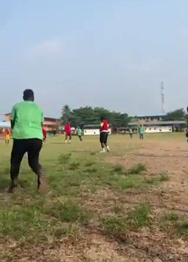 A soccer game is being played on a grassy field. Several players, some in red and yellow jerseys and others in green shirts, are visible. A man in a green shirt and black pants runs along the edge of the field. A school building is visible in the background, along with a utility pole. The sky is clear and blue.