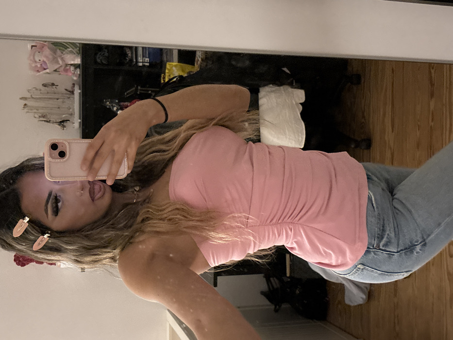 A woman poses for a mirror selfie. She is wearing a pink top and blue jeans. Her hair is wavy and light brown with pink clips. She holds a pink phone with a camera. The background shows a wooden floor, a shelf with various items, and a mirror reflecting the surroundings.