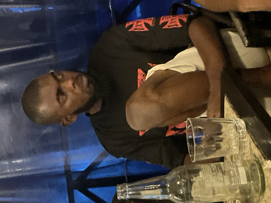 A man in a black t-shirt with red designs sits near an empty glass mug and a clear glass bottle. He has dark skin and a shaved head. Part of a white t-shirt can be seen on his right side, along with a glimpse of another person's arm on the far right. The background shows a blurry combination of blue and black structural elements.