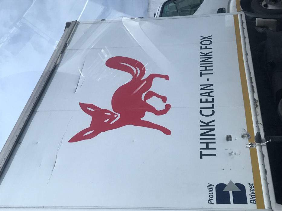- "A tilted side view of a white commercial vehicle features a red fox logo and the phrase "THINK CLEAN - THINK FOX" in bold, black letters" by FM-4m08G2, licensed under CC BY 4.0