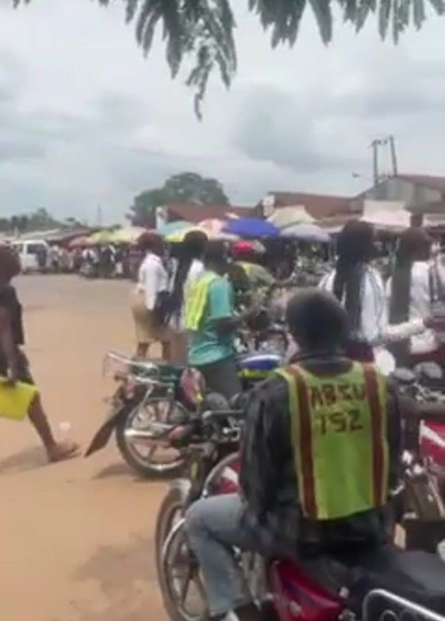 street scene in what appears to be a busy market or town center. Many people are walking around, and several motorcycles are parked or moving. Several people, who appear to be affiliated with "ABSU", are wearing yellow vests and are on motorcycles. There are market stalls with red and white umbrellas. The scene takes place during the daytime under partly cloudy skies.