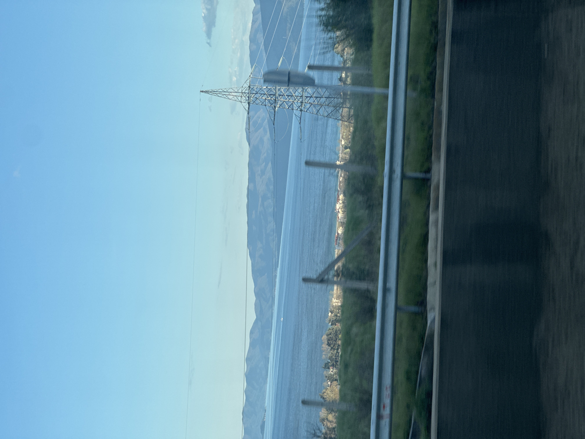 The image depicts a view from a moving vehicle, likely on a highway. The focus is on the landscape to the left, which includes a body of water, possibly a sea or lake, bordered by mountains in the distance. An electricity pylon stands prominently in the foreground. A roadside barrier is visible on the right side of the frame, along with a glimpse of the road surface. The sky is clear and blue. The location is within the general region of Unknown, Greece.