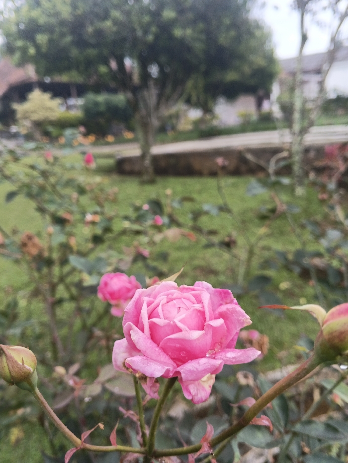 A close-up shows a vibrant pink rose, its petals layered and soft-looking, with tiny water droplets clinging to them. Flanking the rose are two buds, hinting at future blooms. The background is blurred, revealing a garden scene with green grass, other rose bushes, and a stone path leading to buildings and a large tree, suggesting a peaceful outdoor setting.