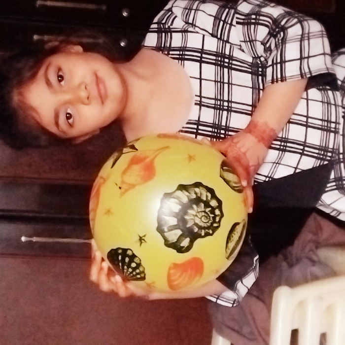 A young female, appearing approximately 5-8 years old, is depicted indoors, framed from the waist up. She possesses dark hair, a light complexion, and looks directly at the camera with a neutral to slight smile. She wears a long-sleeved garment featuring a black and white plaid pattern. Reddish-brown henna designs are visible on her left forearm. She holds a yellow inflatable ball with both hands positioned in front of her torso. The ball is adorned with various marine-themed illustrations, including a prominent dark spiral seashell, other seashells, butterflies, and small star shapes. The background consists of a dark brown wooden surface, possibly a door or cabinetry. A slender, light-colored vertical object hangs in the upper background. A partial view of a light-colored object, consistent with a plastic chair's armrest or back, is visible in the lower-left foreground. The precise location within the city of Lassan, Pakistan, cannot be determined from the visual information provided.