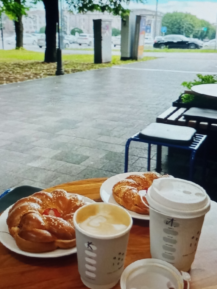 The image depicts an outdoor dining scene at a cafe situated near Plac Społeczny in Wrocław, Poland. The distinctive "Brama Czasu" (Gate of Time) monument, characterized by two large, rectangular, light-colored blocks, is visible in the distant background across a multi-lane road. In the foreground, a wooden table displays several items. On the left, a white circular plate holds a large, braided, golden-brown pastry, possibly a sweet bread, sprinkled with sesame seeds and featuring a central red filling. Adjacent to this, an open light-grey disposable cup contains a latte-style coffee with visible foam art. To the right, another white plate presents two smaller, crescent-shaped croissants, lightly dusted. Next to these, a taller light-grey disposable cup with a white lid stands, and a separate white plastic lid rests on the table. Partial view of blue metal outdoor seating furniture and some small green plants in a container are visible on the right. The midground features a wet, grey paved sidewalk or pedestrian path with scattered debris. A dark lamppost rises from a grassy area to the left, which also contains several trees with green foliage. The background shows a busy multi-lane road with vehicles, including a black sedan, moving in the distance. Two tall, rectangular utility boxes or kiosks are positioned between the road and the previously mentioned "Brama Czasu" monument. Further buildings and trees are discernible against an overcast sky. No individuals are visible in the scene.