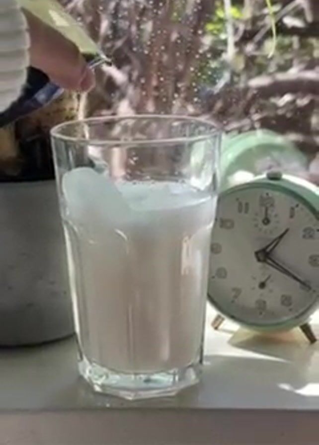 A hand is pouring a dark liquid into a glass of a white liquid with ice. The glass is on a white surface next to a potted plant and a vintage-style green alarm clock. The background includes a window with an out-of-focus view of trees or foliage. The dark liquid mixes with the white liquid to create a layered brown and white beverage.