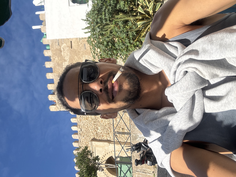 A male subject, with a beard and wearing dark aviator-style sunglasses, is depicted in a close-up, selfie-style photograph. He wears a grey sleeveless shirt and has a grey sweatshirt draped over his shoulders. A lit cigarette is positioned between his lips. The background, under a clear blue sky, displays architectural elements consistent with the historic Kasbah district of Tangier, Morocco. A prominent light-brown stone fortification wall, featuring crenellated battlements along its top, occupies the central and upper-left background. An arched opening in this wall on the left reveals a dark-colored scooter parked on a paved surface and a green wooden gate. To the right of the wall, a white stucco building with a green-framed window is visible, bordered by dense green foliage, including a large succulent plant resembling agave.