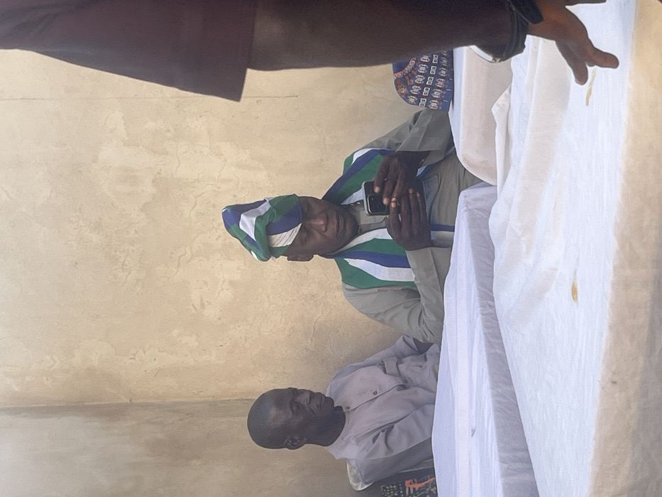 The scene is set in Rido, Nigeria, against a light-colored, textured wall. Two adult males are seated at tables covered with white tablecloths. The male on the left, with dark skin and short dark hair, wears a light gray long-sleeved tunic and is oriented towards the right. The central male, also dark-skinned, wears a light olive-green long-sleeved tunic, a blue, white, and green striped headwrap, and a matching scarf draped around his shoulders. He is actively engaged with a black smartphone, holding it with both hands and looking down at the screen. A dark blue and white patterned traditional cap rests on the table to his right. The foreground features additional white-linened tables, one displaying a small yellowish stain. The right side of the frame shows the partial right arm and shoulder of a third individual wearing a dark garment.