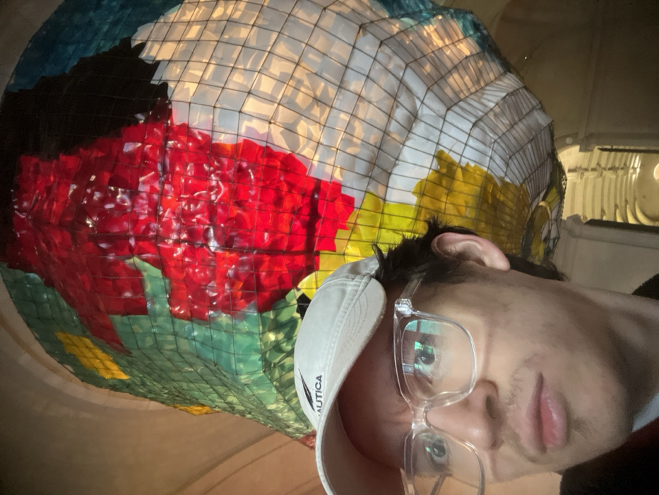young adult male in the foreground, captured in a selfie-style shot from the chest up. He wears a light beige baseball cap with "NAUTICA" embroidered on the front and clear-framed rectangular glasses. His expression is a slight pout, and he looks directly at the camera. Dark hair is visible beneath his cap, and he has light facial stubble. Dominating the background and upper frame is a large, suspended art installation. This sculpture, known as *Elastic Fantastic* (or *Kleurig Spektakel*), by artist Florentijn Hofman, is composed of numerous translucent, irregularly shaped panels held within a dark, grid-like framework. The panels are vibrant, primarily red, green, yellow, and white/light blue, creating an illuminated, abstract form. The artwork is situated within the entrance hall of the Palais des Beaux-Arts de Lille, France. Architectural elements consistent with a grand museum interior, including a high, possibly vaulted ceiling and an arched hallway, are visible in the background, particularly on the right side of the frame.