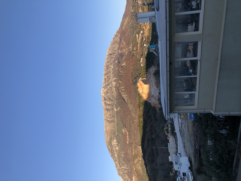 A daytime landscape includes a mountain reaching upwards alongside a clear blue sky. Next to the mountain, a building with windows is partially visible. Near the bottom of the mountain, an industrial zone with construction equipment and parked vehicles can be seen. The photo is taken from a slightly elevated perspective, looking toward the mountain and surrounding area. The image has been rotated, tilting the scene to the side.