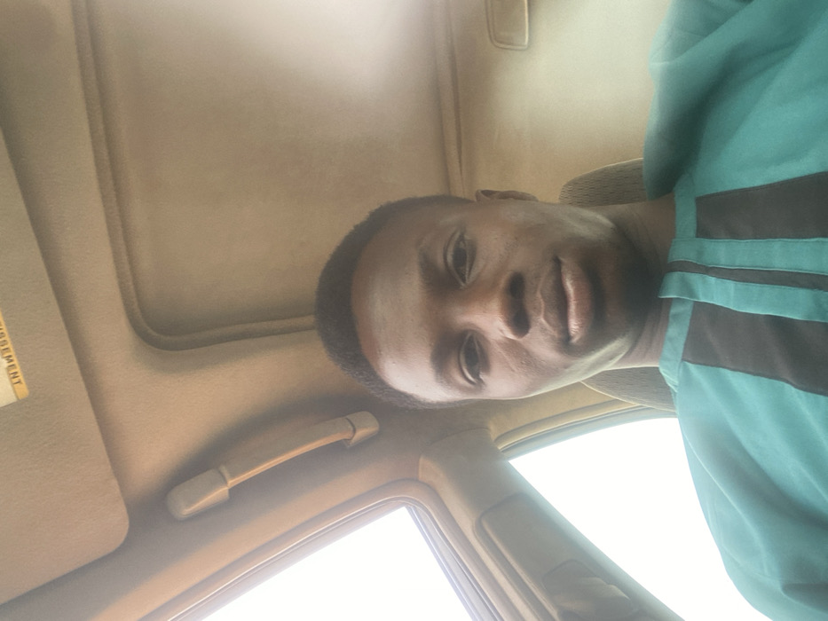 An adult male with dark skin and short dark hair is seated inside a vehicle