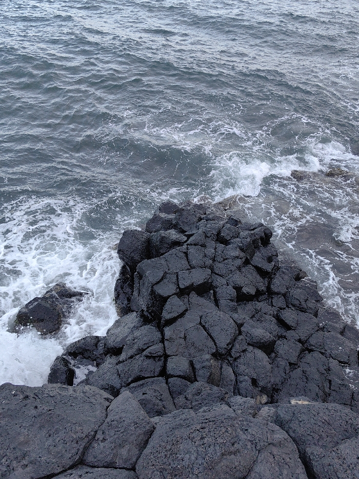 This image depicts a dynamic rocky coastline within the city of Quảng Ngãi, Vietnam, viewed from an elevated perspective. The upper approximately two-thirds of the frame are occupied by dark grey-blue ocean water, characterized by a wavy surface and white foam from breaking waves. The lower portion of the image features prominent, dark grey to black igneous rock formations, exhibiting angular, fractured surfaces consistent with columnar basalt. These rock structures extend into the water, where ocean waves are actively crashing against them, generating significant white foam and spray along the rock-water interface. No human individuals, animals, or man-made objects are visible within the scene. The environment is a natural, active coastal zone.