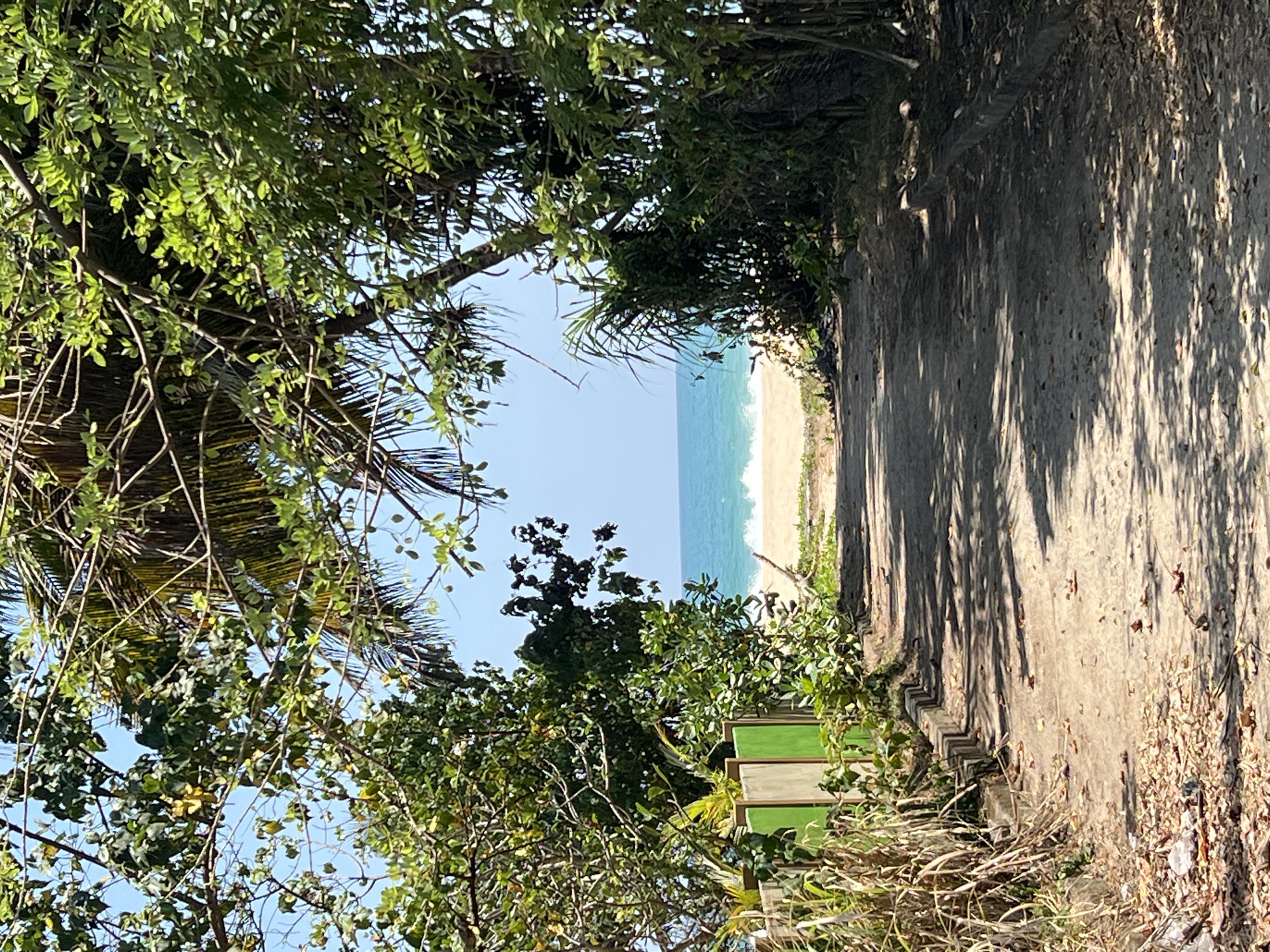 A forensic description of the scene in Habaraduwa, Sri Lanka: The image displays a sunlit, unpaved path leading directly to a beach and the Indian Ocean