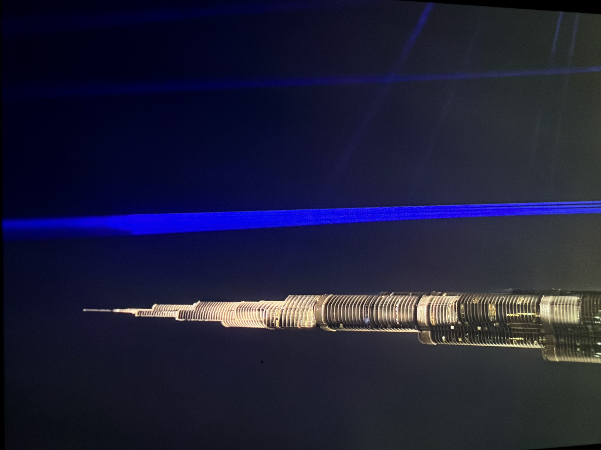 illuminated Burj Khalifa against a dark background, likely at night. There are horizontal streaks of light in the sky above the building. The building is horizontally oriented in the frame. The image is not of Plovdiv, Bulgaria, but of Dubai, United Arab Emirates, where the Burj Khalifa is located.