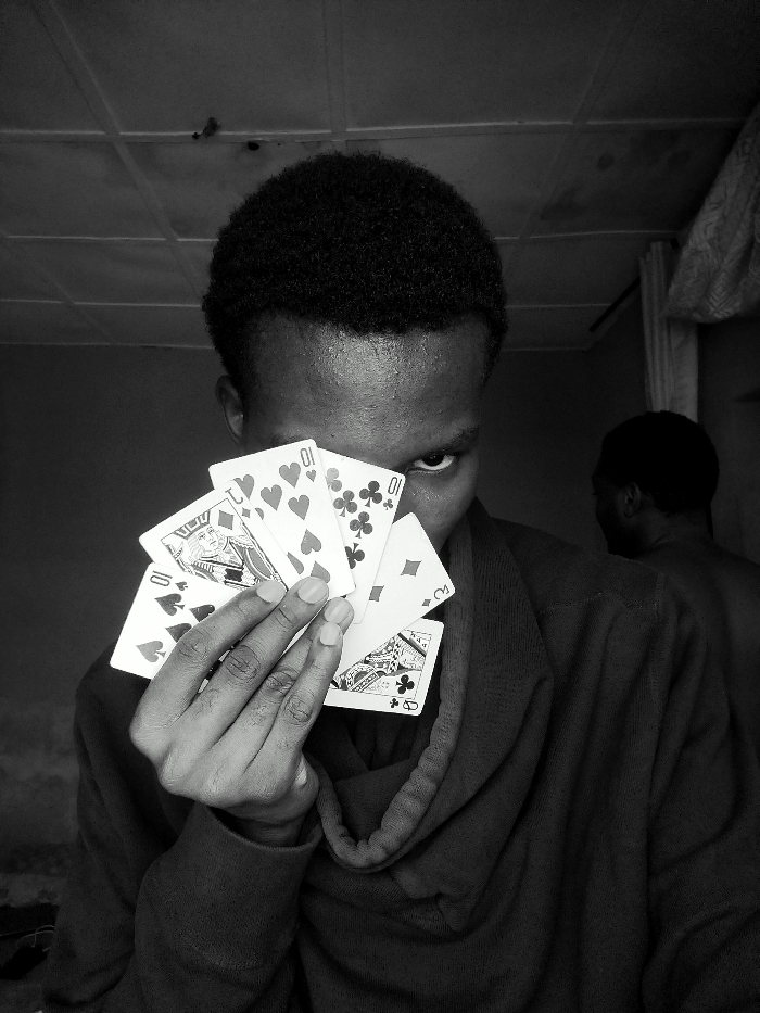 This is a black and white photograph depicting two male individuals in an indoor setting in Keffi, Nigeria. The primary subject, a male with dark skin and short, curly hair, is positioned in the foreground, facing the camera. He wears a dark, hooded top or jacket. His left hand, with visible fingernails, holds a fanned spread of five playing cards, obscuring most of his face. His right eye is visible above the cards, looking directly at the viewer with a steady gaze. The visible cards, from left to right, include a partial Queen of Spades, a Ten of Hearts, a Ten of Clubs, a Three of Diamonds, and a partial Queen of Clubs. In the background, on the right side of the frame, a second male individual is partially visible. Only the back of his head and shoulder are discernible; he appears to be facing away from the camera. The immediate background is dark and indistinct. The ceiling overhead features a grid of rectangular panels. A light-colored, possibly patterned, fabric or curtain hangs partially visible on the far right edge of the image.
