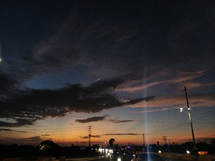 A nighttime shot reveals a sky transitioning from orange to blue, with silhouetted clouds and a crescent moon. Cars with headlights blur along a road, lined with utility poles and sparse vegetation. Streetlights cast a glow, adding to the atmosphere of dusk or dawn.