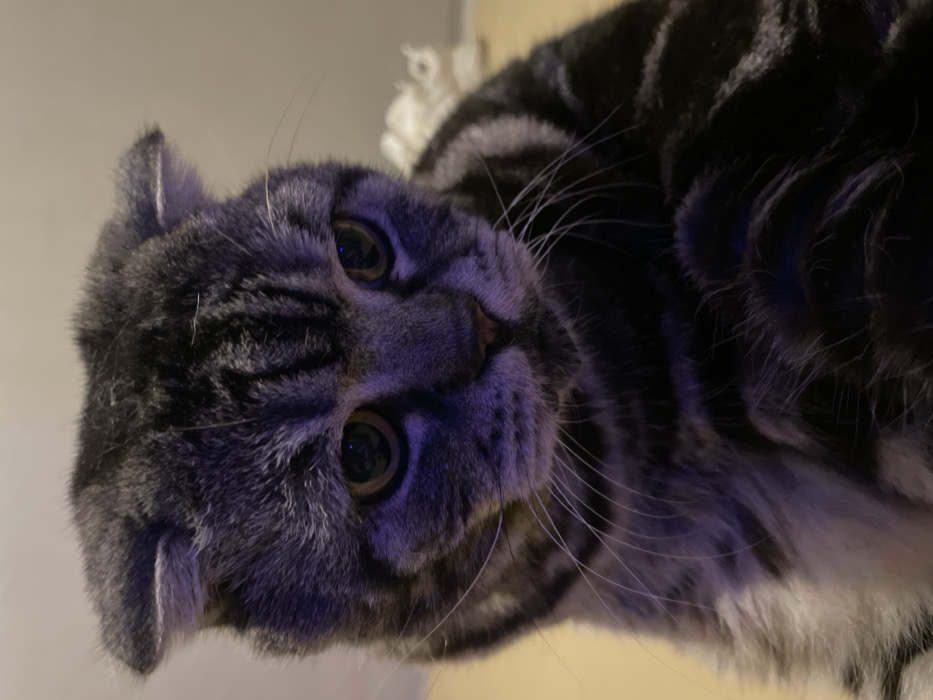 A gray and black tabby cat with folded ears is looking up at the camera