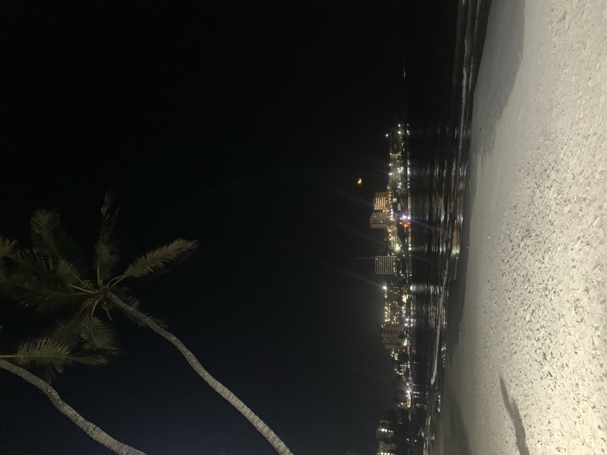 The image depicts a night scene at a beach in Pampatar, Venezuela. The coastline curves from the right edge towards the center of the image. The sandy beach takes up the right side, with darker wet sand closer to the water's edge. The sea is dark, reflecting the city lights. A city skyline is visible in the distance, punctuated with illuminated buildings and streetlights. A crescent moon is visible in the sky above the city. Two palm trees are situated on the left of the frame with their fronds visible against the dark night sky. The rest of the sky is black.